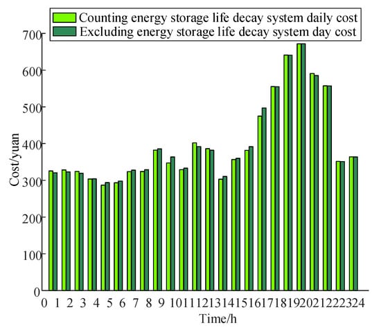 Figure 10 shows the daily operating cost of the system under the two cases. The daily operating cost of the system is CNY 9139.3656 when storage life decay is not taken into account and CNY 9081.6026 when storage life decay is taken into account, with a comprehensive cost reduction of CNY 57.763. During the operation of the system, the battery not only effectively plays the role of peak-shaving and valley-filling, shortening the peak-to-valley difference of the system, but also reduces the operating costs of the system and improves the economy of the system.