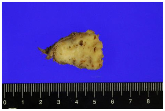 Surgical excision of the tumor was performed with the patient under general anesthesia. Macroscopically, the surgically resected specimen, measuring 3.2 × 2.5 × 2.5 cm in size, shows a grayish-white solid mass (Figure 3).