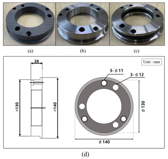 Photographs and drawing of chuck adapter. (a) CFRP, (b) steel, (c) CFRP with steel, and (d) drawing.