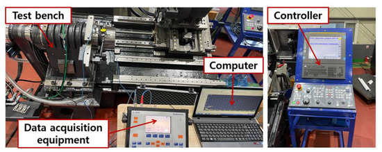 A chuck adapter vibration experiment was conducted using a lathe machine (SE2200A, Hyundai WIA, Changwon, Republic of Korea). A chuck adapter was attached to the chuck, and the chuck was attached to the lathe for the vibration experiment. A controller was used to operate the lathe, and the experiment was conducted at 10, 500, and 1000 rpm. A system capable of monitoring the vibrations through a computer connected to data acquisition equipment was established. Figure 4 shows the equipment used for the chuck adapter vibration experiments.