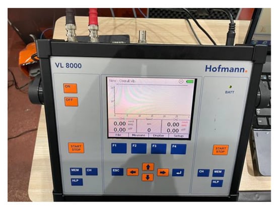The equipment used in this test (Figure 5) is a vibration measuring device (VL8000, Hofmann, Pfungstadt, Germany) with a resolution of 0.1–200 mm/s, a vibration half range of 0.05 mm/s, and an uncertainty of 0.0289 mm/s. The bandwidth of the measuring device was determined to be 10 Hz–10 kHz using the root mean square (RMS) method.