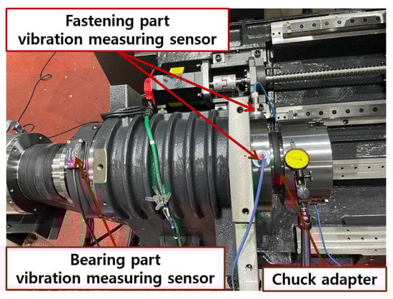 During the test measurement, the vibration measurement position of the chuck adapter was one point for the bearing part and two points for the fastening part, and the values were compared by assigning the effective RMS value, peak value, and peak-to-peak value to the vibration velocity settings. The environmental conditions during the experiment were a temperature of 21.0 ± 1.0 °C and a relative humidity of 50 ± 5%. Measurements were repeated five times each. The measurement points are shown in Figure 6.