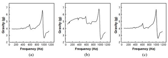 The vibration measurements were conducted according to the ISO 10811-1 [25] standard. Natural frequency data were obtained using the K2/L sine vibration control system software(IMV, Osaka, Japan). Natural frequency experiments were conducted at a frequency of 2 kHz, gravity acceleration of 4 g, time period of 518 s, and vibration of 172 kilocycles. The frequency response signals showed similar trends for each of the three types as shown in Figure 8. The resonance frequencies were concentrated in the range of 980–1000 Hz for all three types. The results are presented in Table 6. The experimental conditions were determined to consider the natural frequencies of each of the three types of chuck adapters at 10, 500, and 1000 rpm. In addition, durability experiments were conducted at a frequency of 545 Hz, gravity acceleration of 4 g, time of 1800 s, and vibration of 172 kilocycles. The samples were stable with no vibration defects or damage during the durability experiments.