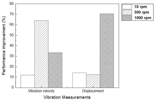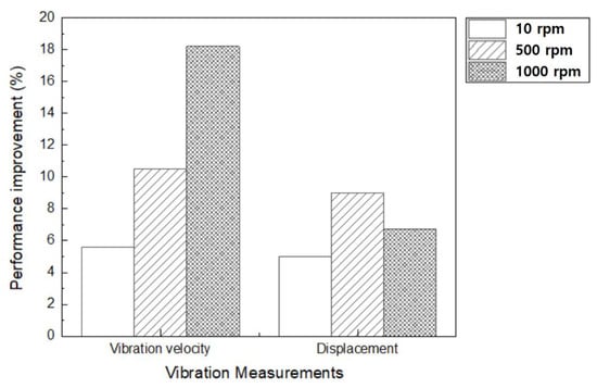 Table 10 shows displacement due to vibration measurement. The displacement for the CFRP chuck adapter increased by 79%, the steel chuck adapter by 108%, and the steel chuck adapter by 40%. The vibration velocity and displacement of the CFRP chuck adapter were the lowest at all rotational speeds. The minimum and maximum performance improvement rates of the vibration velocity for the fastening part were 12.5% and 31.1%, at 500 rpm and 1000 rpm, respectively. Figure 10 shows the performance improvement rate of the CFRP chuck adapter compared to steel in the bearing part. Overall, the CFRP chuck adapter has better or similar displacement than the conventional steel chuck adapter in the fastening part.