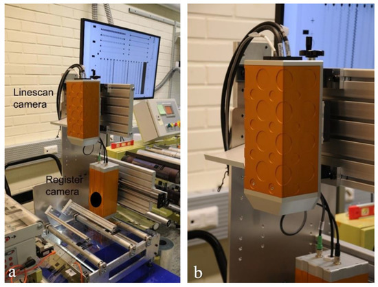 (a) Line scan camera and register camera installed on a reeling machine. (b) Close-up image of the line scan camera.