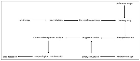 The sub-images cropped from the sample image dataset were then superimposed on their corresponding counterpart from the reference image. The sub-images were then converted to greyscale images and aligned with their corresponding reference sub-images using a homography algorithm [13] to match both sub-images over each other and eliminate any misalignments or offsets between the reference and sample sub-images based on Equations (1) and (2). As all the images taken by the camera were placed over a fixed position before capturing, the alignment algorithm had to implement a minor adjustment.