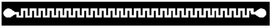 The structures of flexible resistance lines were prepared at a roll-to-roll pilot line using rotary screen printing techniques. The layout included various shapes (straight, horseshoe, round-edged meander, and straight-edged meander) with different nominal line widths of 80 µm, 100 µm, 300 µm, 500 µm, and 1000 µm, respectively (Figure 1).