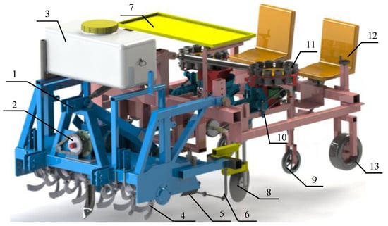 Structure of the 2ZBX-2A compound vegetable transplanter. Note: 1, three-point hitch system; 2, transmission system; 3, watering system; 4, rotary component; 5, ridging opener; 6, plastic film frame; 7, plug seedling shelf; 8, soil-covering disc; 9, depth control system; 10, double-crank five-bar planting mechanism; 11, rotary delivery mechanism; 12, chain; 13, adjustable supporting wheel.