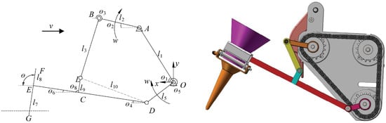 The mathematical model of the mechanism is shown in Figure 4. Take the O point as the coordinate center, the horizontal direction as the x-axis, and the vertical direction as the y-axis in order to establish a rectangular coordinate system. The planting trajectory for point G, which is the point of the planting duckbill penetrating into the soil, is