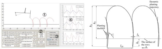 Based on the human–computer visual interface of the five-bar transplanting mechanism, the parameters of the planting mechanism were optimized by analyzing the relationship between the machine operation speed, planting distance, and the dynamic transplanting trajectory so that the seedlings could be planted with an upright posture.
