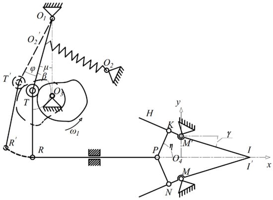 Schematic diagram of the opening and closing control mechanism of the planting duckbill. Note: I, the end point of the transplant duck’s beak; O4, the pivot center of the duck’s beak; M and M’, the articulation points on the transplant duck’s beak; RP, the pull cable acting on the hinge point P; O3, the cam rotation center; T, the lowest point of the roller center; T’, the highest point of the roller center; R, the lowest point of the drive cable; R’, the highest point of the drive cable; μ, the initial angle of the pendulum O1T; β, the fixation angle of the swing rod O1T and pull rod TR; φ, the swing angle of the pendulum rod O1T; γ, the angle between the KI side of the planting duckbill and the x direction.