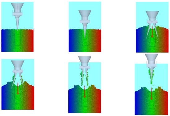 Based on the above mathematical models, a DEM simulation of the interaction between the plug seedling (seedling substrate size: 30 mm × 30 mm × 40 mm) and the planting duckbill was carried out to determine the optimization value of angle γ (Figure 7). In the simulation, the solanaceous vegetable seedling tray size was determined to be 30 mm × 30 mm× 40 mm according to the seedling cultivate standard.