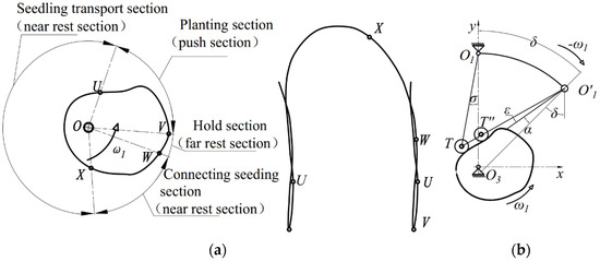 Schematic diagram of the cam, which controls the opening and closing of the planting duckbill. (a) Work sections of the cam and corresponding location on relative trajectory; (b) coordinate system of oscillating roller push rod cam mechanism. Note: U, the starting point of seedling planting; V, the end point of seedling planting; W, the closed point of duckbill; X, the start point of seedling pickup.