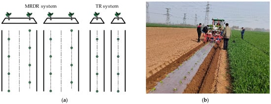 The field experiments. (a) The comparative treatments; (b) the 2ZBX-2A compound vegetable transplanter under the MRDR system.