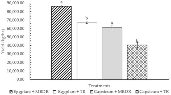 Fresh yields of eggplant and capsicum under the MRDR and TR cultivation systems. Note: means of the same crop within a column followed by the same letters are not significantly different at p = 0.05.