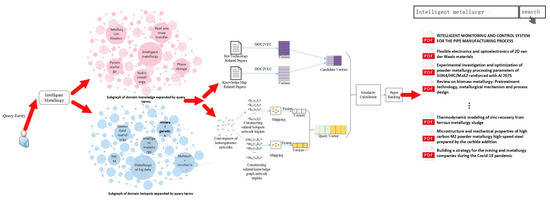The paper firstly relies on the authors’ previous research to achieve the following: extract the domain knowledge subgraphs related to query terms from the existing domain knowledge map; construct the domain hotspot subgraphs related to query terms from the current domain literature hotspot identification model; extend the query terms to make the query content rich in domain knowledge and domain hotspot information, transform the heterogeneous network formed by the domain knowledge and domain hotspot from the query term extension to the relevant model and then carry out vectorized representation, i.e., vectorized representation of query terms, calculate the similarity between the query term vector and the preprocessed literature vector set and then turn it into a TOP-N problem for solving; see Figure 2. For example, when we use “intelligent metallurgy” as the search query term, based on the domain knowledge map and hot words set formed by the author’s previous research, the domain knowledge subgraphs with “heat and mass transfer, metallurgical kinetics, pyrometallurgy, hydrometallurgy, phase change” as the backbone were formed. At the same time, we have created the subgraphs of “metallurgical first-principles calculation, mineral genetics, big metallurgical data, molecular mechanism, and special field metallurgy” as the backbone hot. The domain knowledge subgraph and the domain hotspot subgraph are fused into a query vector by the model algorithm, and the most suitable relevant literature is recommended after matching with the filtered candidate literature set; see Figure 2.