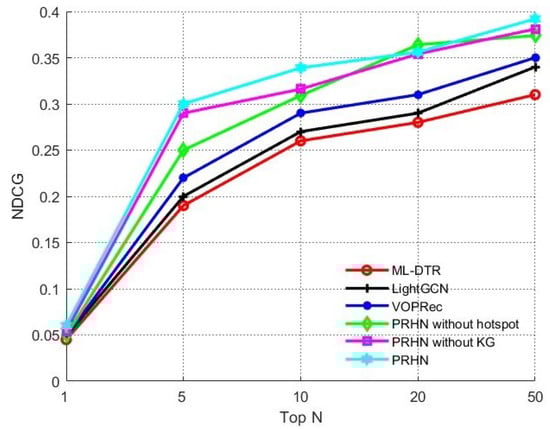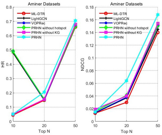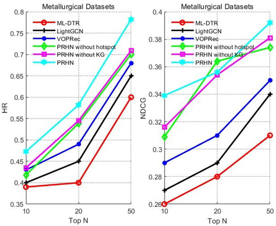 The PRHN-without KG model is improved after adding hotspot information compared to other models, indicating that the method of adding hotspot information is compelling. The PRHN-without-hotspot model is also improved by including a metallurgical knowledge map, and it is more effective than the PRHN-without-KG model. The experimental results show that domain knowledge map information is more critical in literature recommendations than hotspot information. The PRHN has the most significant impact by including both hotspot information and a metallurgical knowledge map, verifying that the two types of information added are correct. The effectiveness of the two types of information added is also validated.