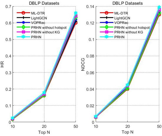 PRHN-without hotspot (paper recommendation model via heterogeneous network embedding without hotspot): This paper proposes an ablation model for removing domain hotspot information in a two-tower recommendation model. The query terms and the domain knowledge graph extended by the query terms are used as the model’s input data.