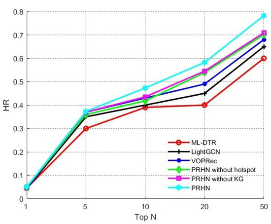 HR (Hit Ratio) is the ratio of the total number of documents to the number of documents in the dataset that appear in the Top-N recommendation list. The range of HR-value is 0–100%.