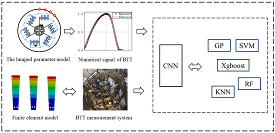 This research develops a numerical model of the concentrated parametric vibration of blades and a numerical model of the BTT signal acquisition. The measurement deviation and noise are also added to the BTT data. The blades with crack faults, crack locations, and crack depth under uniform speed conditions are diagnosed, and the study compares several machine learning approaches to confirm the detection accuracy of the proposed CNN fault diagnostic model.