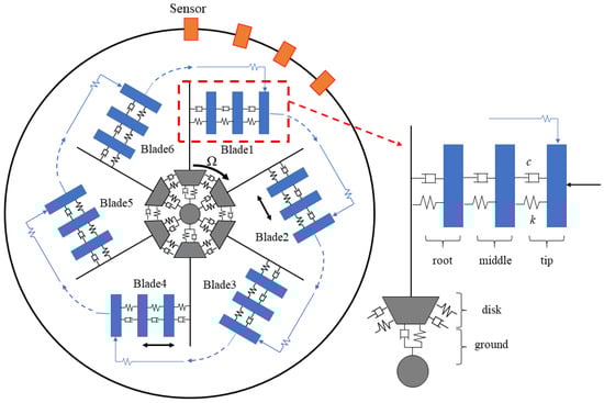 A lumped parameter model for the combined cracked blade fault diagnosis problem is developed in this research, as shown in Figure 2. The whole circle blade model consists of 6 sectors, all of which are composed of 3 degrees of freedom, including the tip, body, and root of the blade, and 1 degree of freedom, including the rotor disk. The center of the rotor disk is connected to the rotor shaft to rotate the disk around the rotor shaft. The blade only vibrates in the direction of rotation. A dry friction-damping structure generates relative friction between the tips of adjacent blades based on their relative motion. The blades are modeled with 3 degrees of freedom in this work, which can demonstrate higher-order complex motion patterns in blade vibration. A total of four sensors are evenly distributed around the perimeter of the blades, with a 15° angle between them.