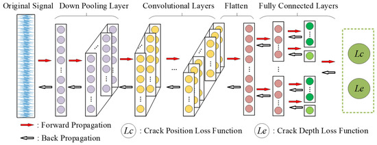 A 1-D convolutional neural network (CNN) structure for blade crack fault detection is designed in this research, as shown in Figure 4. The vibration signal of cracked blades, obtained by numerical simulation or experimental test, is the input of the CNN network. The kernel size of the downsampling layer is 11, the step size is 4, and the kernel channel size is 64. In this research, a 5-layer 1-D convolutional network with a kernel size of 5 is adopted. Multiple layers of small convolutional kernels can make the network deeper, resulting in better feature representation and contributing to better network performance [27]. The last layer of the fully connected layer consists of two parts: the upper layer with output size 4 is used to output the crack location feature, and the lower layer with output size 1 is used to output the crack depth feature. The weights for the loss functions of the classification and regression tasks are adopted to generate the loss function of the total task. Adam is used in the optimizer, and the initial learning rate is set to 0.001. MSE and CrossEntropyLoss are adopted as cost functions to predict the value and type, respectively.