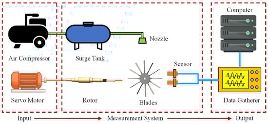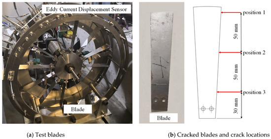 There are many ways to monitor the real-time status of blade crack faults. Spitas et al. [3] measured the change in potential difference by placing three electrodes on the specimen’s surface to obtain the shape parameters of the crack. However, this method required attaching electrodes to the surface of the specimen, and the measurement in the rotating state was not independently verified. Krause et al. [4] detected damage to wind turbine rotor blades by using audio classification techniques, but the technique was ineffective for monitoring blades with progressive cracks or in a cabinet with loud airflow. Abouhnik et al. [5] proposed the empirical decomposition characteristic strength level (EDFIL) method for the diagnosis of blade cracks by measuring the real-time vibration of the wind turbine. However, this method was an indirect measurement, which was not able to measure vibration energy concentrated in the blade, such as in a blade–impeller system with a strong rotor stiffness.