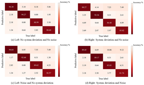 This section shows the fault diagnosis results obtained by the CNN method in this study for four cases in terms of crack location and depth. The confusion matrix of the blade crack location detection results is depicted in Figure 9. Positions 0 to 3 indicate no crack, top cracks, mid cracks, and root cracks, respectively. In addition, the values in the matrix reflect the proportion of correct detections in the true value to the total number of results in that category. As shown in Figure 9, the classification of crack faults is weak for locations 2 and 3; locations 0 and 1 are better, and the classification results are more than 80% for each case. The results show that the CNN is very effective at this task. However, many crack faults are not diagnosed as cracks, since the crack fault characteristics are imparted upon the no-crack blades during the coupling action, leading to confusion in the diagnostic identification. It is evident from a comparison of Figure 9a–c that deviations have a stronger influence on crack fault prediction, particularly for the prediction of no cracks. Since noise has less impact on the identification method than systematic deviation does, system deviation directly affects the identification of blade vibration characteristics.
