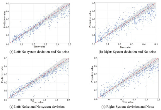 Figure 10 shows the blade crack depth prediction results for four different cases. It can be seen that the detection results in Figure 10a,c are relatively stable throughout the whole change in crack severity, and the errors are mostly within 10%, while the detection results in Figure 10b,d have larger errors between the predicted and real values due to system deviation and noise. The prediction accuracies are calculated to be 95.4%, 90.7%, 94.6%, and 87.5% for the four cases, respectively. Comparing Figure 10a–c, the noise has less impact on the prediction of blade crack depth. It is clear that the system deviation causes the data to have a more discrete distribution, increasing the error between the predicted and true values. The reason is that the system deviation directly affects the results of the BTT signal recognition.