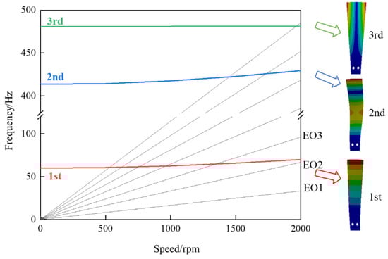 The Campbell diagram of blade vibration and the modal vibration patterns for the first three orders of vibration are given in Figure 11. The result shows that the first-order resonance of the blade may occur between 500 rpm and 1500 rpm for integer multiples of the speed, with resonance points of 611.4 rpm, 739.9 rpm, 936.9 rpm, and 1292.0 rpm for the line of excitation from three to six, corresponding to vibration frequencies of 61.14 Hz, 61.66 Hz, 62.46 Hz, and 64.60 Hz.