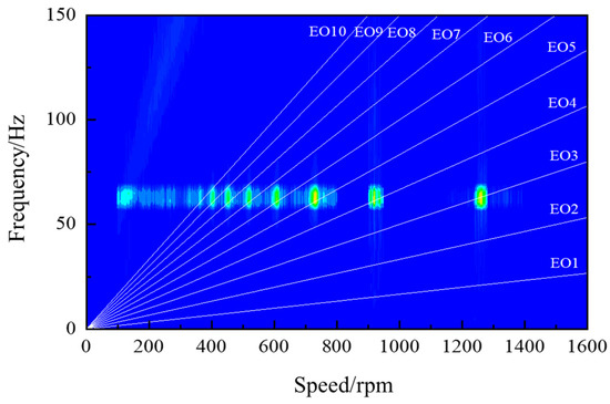 The test speed is set to rise from 0 rpm to 1600 rpm with a uniform acceleration for 96 s and a maximum speed frequency of 26.67 Hz. As shown in Figure 12, the Campbell diagram of blade vibration is obtained using wavelet analysis based on the measured strain gauge’s time-domain signal. It can be seen that the blade resonates at multiple multiples in the speed range.