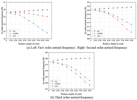In the numerical model, the natural frequencies at nine uniform depths from 1/30 to 9/30 were analyzed at each crack depth, considering the crack locations at the top of the blade, the middle of the blade, and the root of the blade, respectively.