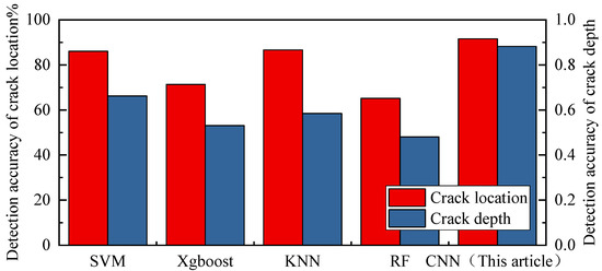 Through comparison, the CNN model proposed in this research is better than the traditional machine learning model in multiple ways. The traditional machine learning model typically can only utilize a single task detection problem, whereas the CNN model can utilize a multi-task problem of crack location and depth at the same time. The detection accuracy of the CNN model established in this paper is significantly higher than that of the five different traditional machine learning models, and the CNN model shows stronger adaptability under system deviation and noisy working conditions.