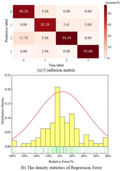 The confusion matrix of crack location classification for the test set is shown in Figure 15a. Furthermore, the classification accuracy for the blade crack failure location is high. Only part of location one (the crack in the top) is incorrectly predicted as a crack in other locations, which also contributes to its relatively low prediction accuracy. The main reason may be the small effect of crack position one on blade frequency and the small difference in vibration amplitude of the cracked blade, which also corresponds to the results in Figure 13. Figure 15b shows the density statistics of the relative errors in the test results. The bar graph represents the density of distribution within each error interval, and the curve represents the Gaussian distribution of relative errors. When the width of the curve is smaller and the centerline is closer to 0, it indicates that the predicted results are more accurate. From the figure, it can be seen that the error of most of the predicted values of the crack degree is within ±20%.