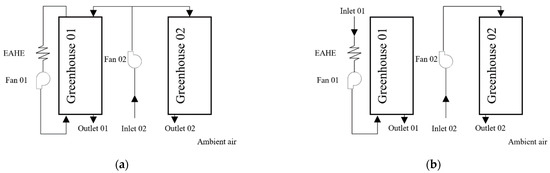 From Figure 1, it can be seen that there are two fans. In the closed loop, Fan 1 is responsible for blowing the air that comes from the GH to EAHE to GH again (Figure 2a), and Fan 2 is responsible for the air change of both GHs with the ambient air. While in the open loop, Fan 1 is responsible for blowing the air from the ambient to EAHE to GH (Figure 2b), and Fan 2 is responsible for the air change of the second greenhouse.