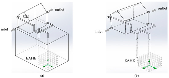 Layouts of GH + EAHE with the reference GH. (a) Closed-loop schematics. (b) Open-loop schematics.