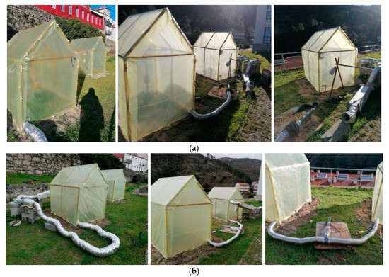 Figure 1 shows how the GH + EAHE were connected, namely in the closed-loop (a) and in the open-loop (b). The study was divided into two parts. In the first part, the heaters were turned off. In the second part, they were switched on.