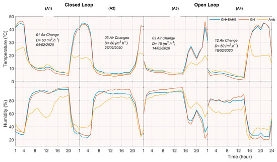 Figure 4 shows the variations in temperature and humidity inside and outside the greenhouses. The figure shows that as the air temperature decreases, the humidity increases, and at less than 15 °C drives to the humidity exceeds the levels already mentioned as harmful to plants (>80–90%) [20]. The differences between the GH and GH + EAHE microclimates range from 2.5 C to 5 C in air temperatures, and the differences in relative humidity vary from 8% to 12%. GH + EAHE microclimates’ relative humidity is lower compared to GH. The increase in humidity at night is due to the decrease in temperature, which leads to increased condensation. However, in A3 and A4, the air temperature at night was warmer than in GH + EAHE. In addition, the air temperature was cooler during the day. It must be emphasized that the GHs with microclimates at reduced scale are only used to study the differences that occur when the EAHE system is used, and the design isn’t the same as industrial GH.