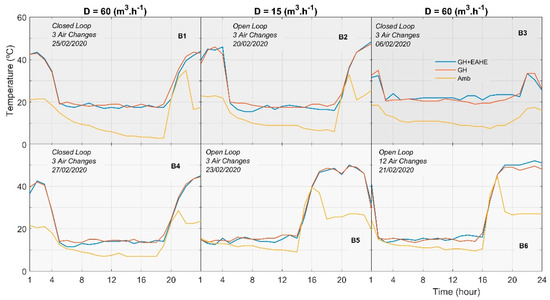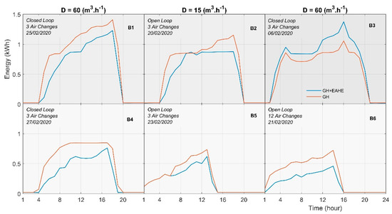 Figure 5 shows the heaters with different set temperatures, where Tset = 18 °C in B1 and B2, Tset = 20 °C in B3, and Tset = 15 °C in B4, B5, and B6. However, GH and GH + EAHE are quite similar, the differences in air temperatures in the microclimates are between 3.5 °C and 7.5 °C.