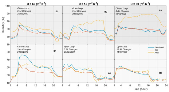 Figure 6 shows the differences in relative humidity variations in the microclimates of the GHs. The highest values are measured at night in the GH + EAHE and range from 8.5% to 37.5%. We suspect that these values are due to condensation, and these measurements are consistent with the work of Qi et al. [18].