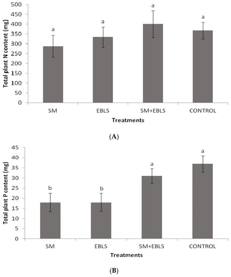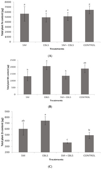 The total plant content for the macronutrients did not significantly differ among the treatments, with the exception of P, where significantly lower contents were determined in the SM and EBLS (Figure 1). Concerning the micronutrients, a significantly higher Mn content was found in the EBLS compared to the SM and SM + EBLS. Similarly, for Zn, a significantly higher total content was determined in the EBLS compared to the SM + EBLS and the control (Figure 2).