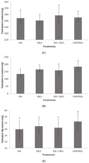 Total plant N (A), P (B), K (C), Ca (D), and Mg (E) content among the treatments. The different letters on the bars symbolize statistically significant differences among the treatments, according to Duncan’s multiple range test for p ≤ 0.05. SM = sheep manure; EBLS = organic material (litter) from evergreen broadleaf species, i.e., from Quercus sp.