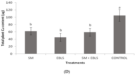 Total plant Fe (A), Mn (B), Zn (C), and Cu (D) content among the treatments. The different letters on the bars symbolize statistically significant differences among the treatments, according to Duncan’s multiple range test for p ≤ 0.05. SM = sheep manure; EBLS = organic material (litter) from evergreen broadleaf species, i.e., from Quercus sp.