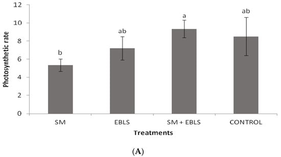 The photosynthetic rate of the olive plants was significantly higher in the SM + EBLS compared to the SM. Insignificant differences in the photosynthetic rates were recorded among the other treatments (Figure 3A). Similar results were also obtained for the intercellular CO2 concentration, where a significantly higher CO2 concentration was recorded in the SM + EBLS and the EBLS compared to the SM and the control (Figure 3C). A similar tendency was determined among the treatments for stomata opening, although the differences were not significant (Figure 3B). Finally, the WUEi was significantly lower in the SM and the EBLS compared to the SM + EBLS and the control (Figure 3D).