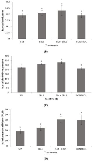 Photosynthetic rate (μmol CO2 m−2 s−1) (A), stomatal conductance (mol m−2 s−1) (B), intercellular CO2 concentration (μmol CO2 mol air−1) (C), and intrinsic water use efficiency (μmol CO2 mol H2O−1) (D) of the olive plants among the treatments at the end of the experiment. The different letters on the bars symbolize statistically significant differences among the treatments, according to Duncan’s multiple range test for p ≤ 0.05. SM = sheep manure; EBLS = organic material (litter) from evergreen broadleaf species, i.e., from Quercus sp.