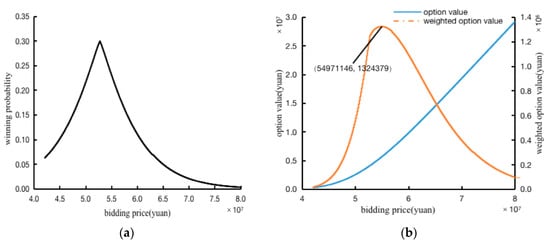 Optimal decision determination of bidding price. (a) Fluctuation trend of winning probability; (b) Fluctuation trend of option value and weighted option value.