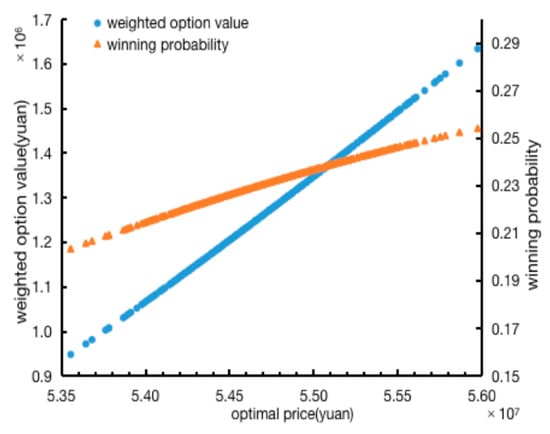 The winning probability increases first and then decreases due to the deviation degree of the price and the group characteristics. Therefore, the option value weighted by the winning probability has the maximum objective function and the optimal bidding price. The optimal numerical solution of the model is 5.50 × 107 CNY, which is 0.15% higher than the analytical solution, mainly affected by the iteration step size. It is considered that the numerical solution is consistent with the analytical solution, and the numerical solution model can be used for correlation analysis.