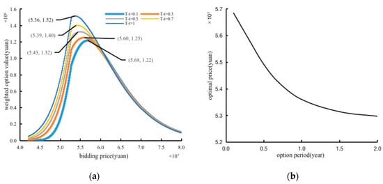 To study the relationship between the optimal price and the option period further, the curve is drawn as shown in Figure 5b. As the extension of the period, the sensitivity of the optimal price decreases, and when the period is less than 0.5 years, the optimal price makes a linear response to the option period. That is because if the period is short, the enterprise will pay more attention to the influence of internal strength which tends to be stable in a short time. Then, it decreases gently until the period exceeds 1.5 years, and the curve tends to be stable. The optimal bidding price has an average sensitivity of 7.70% to the period.