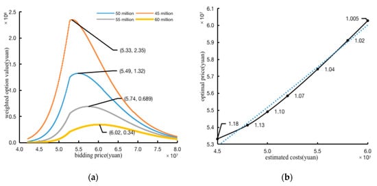 The estimated costs in the bidding preparation stage have volatility, due to the changes in market environments. The one-way sensitivity analysis of the cost volatility level, σ, is carried out, and the results are shown in Figure 4. With the increase in the volatility level, the maximum weighted option value increases, while the price corresponding to it, the optimal price, decreases. In other words, with the increase in the uncertainty of the market environments, the competitors will put forward a lower bidding price to obtain a higher option value, thus the average value of group bidding prices will be reduced. Then, the enterprise will put forward a bidding price closer to the average, to obtain a greater option value.