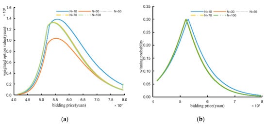 The one-way sensitivity analysis of the number of competitors, N, is carried out, and the results are shown in Figure 7. The bidding price, weighted option value and the winning probability are not sensitive to changes in the number of competitors in the same bidding project. This is because the bidding price is more influenced by the average than the number of competitors. Assuming that the other parameters are constant, an increase or decrease in the number of competitors does not affect the trend in the winning probability and the weighted option value when there is no significant change in the average.